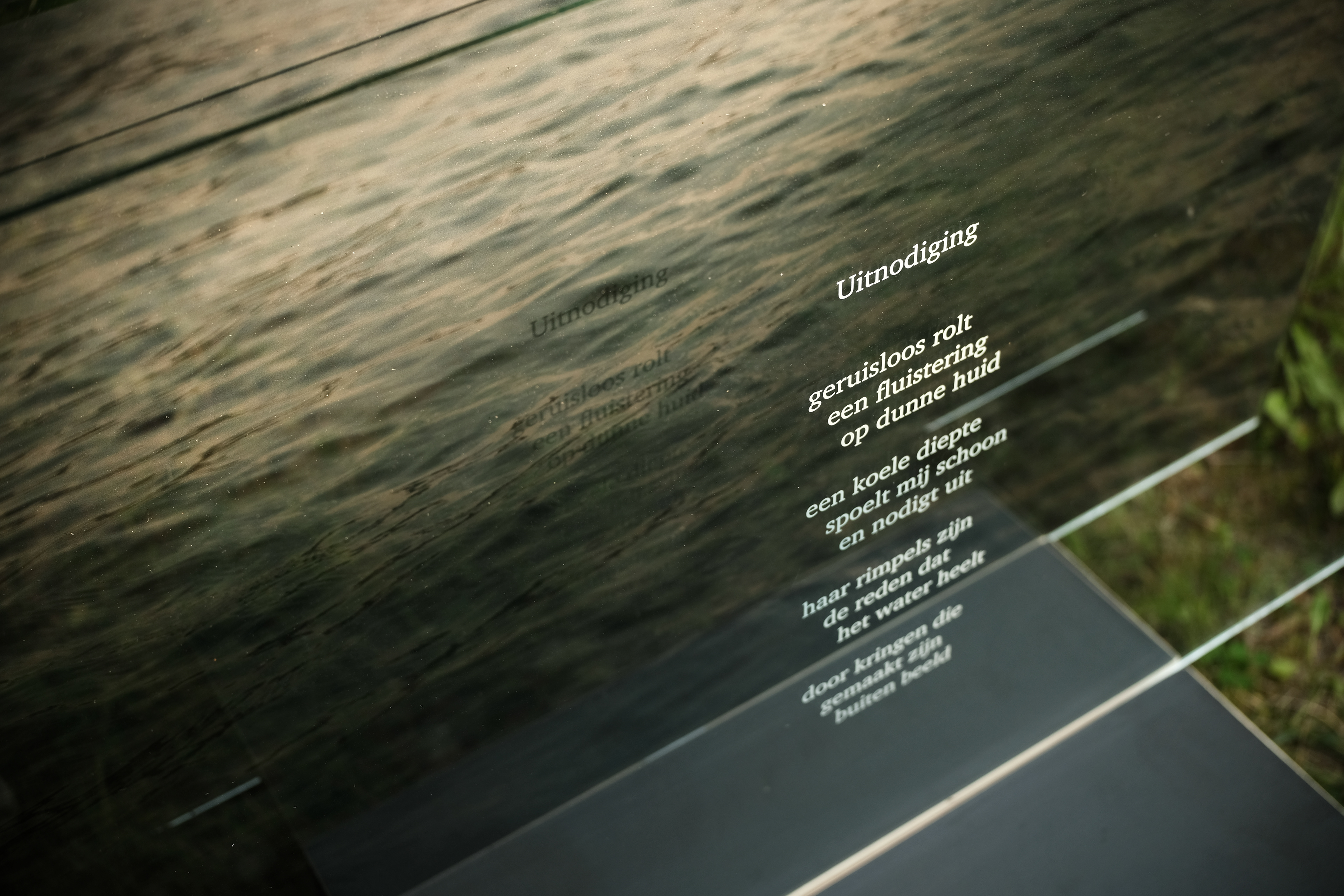 Water beweegt, fluistert, verbergt. Het golft en rimpelt, nodigt uit en daagt uit. In deze kunstinstallatie ontmoeten beeld en taal elkaar. Ervaar de zachtheid van stroming, de speelse aanraking van het oppervlak. En ontdek wat onder de waterspiegel schuilt.